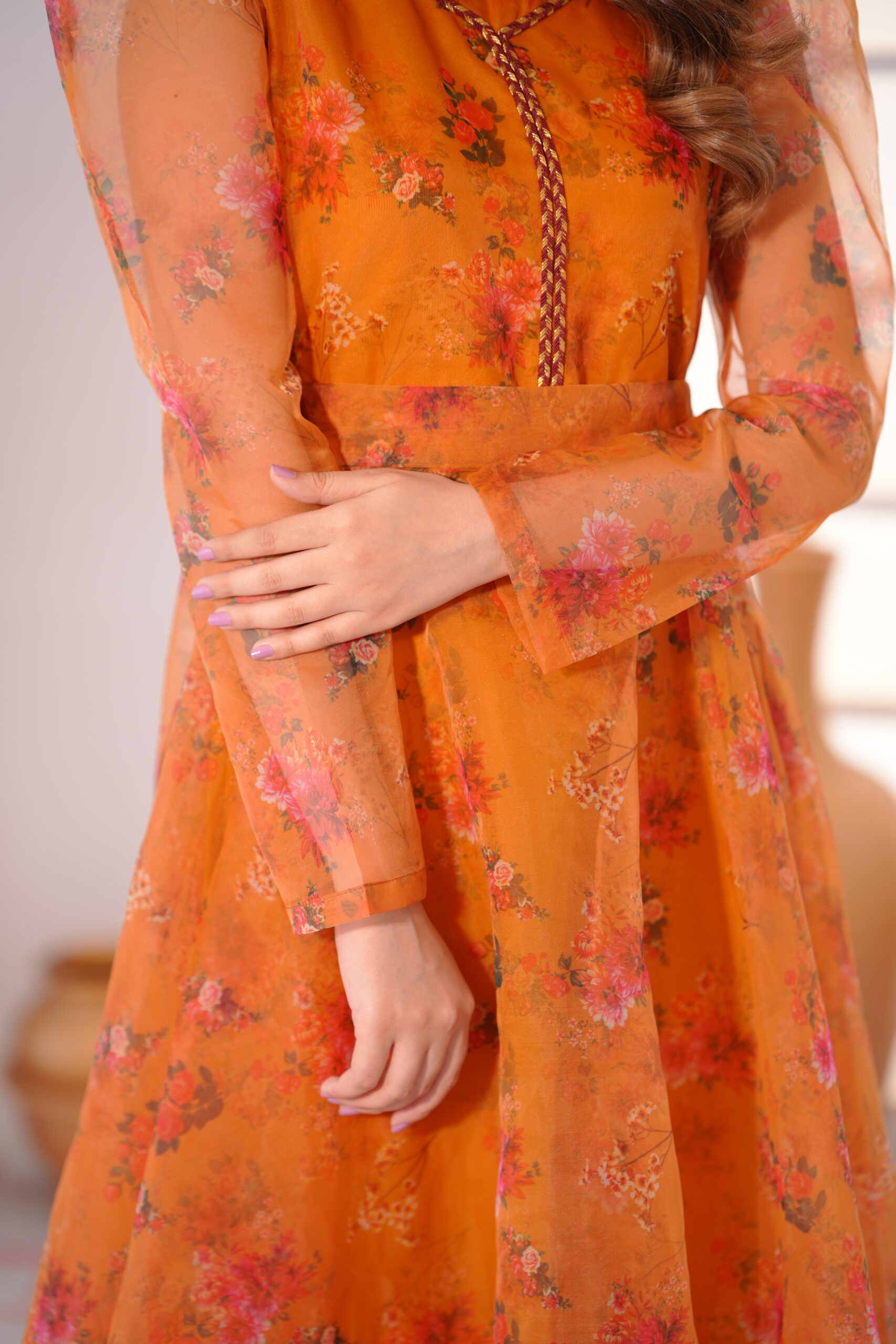 Celebrate effortless elegance with this basant organza frock, designed in a vibrant mustard hue