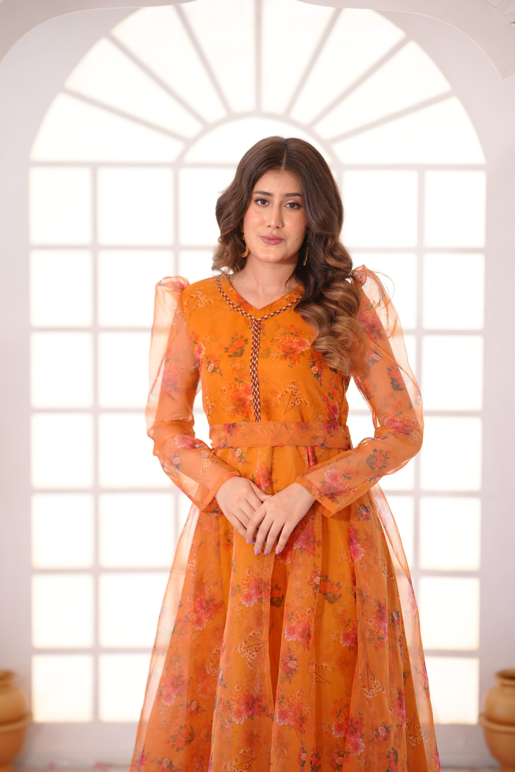 ORGANZA PRINTED FROCK – FLARED SILHOUETTE – PUFF SHOULDER – FULL LENGTH