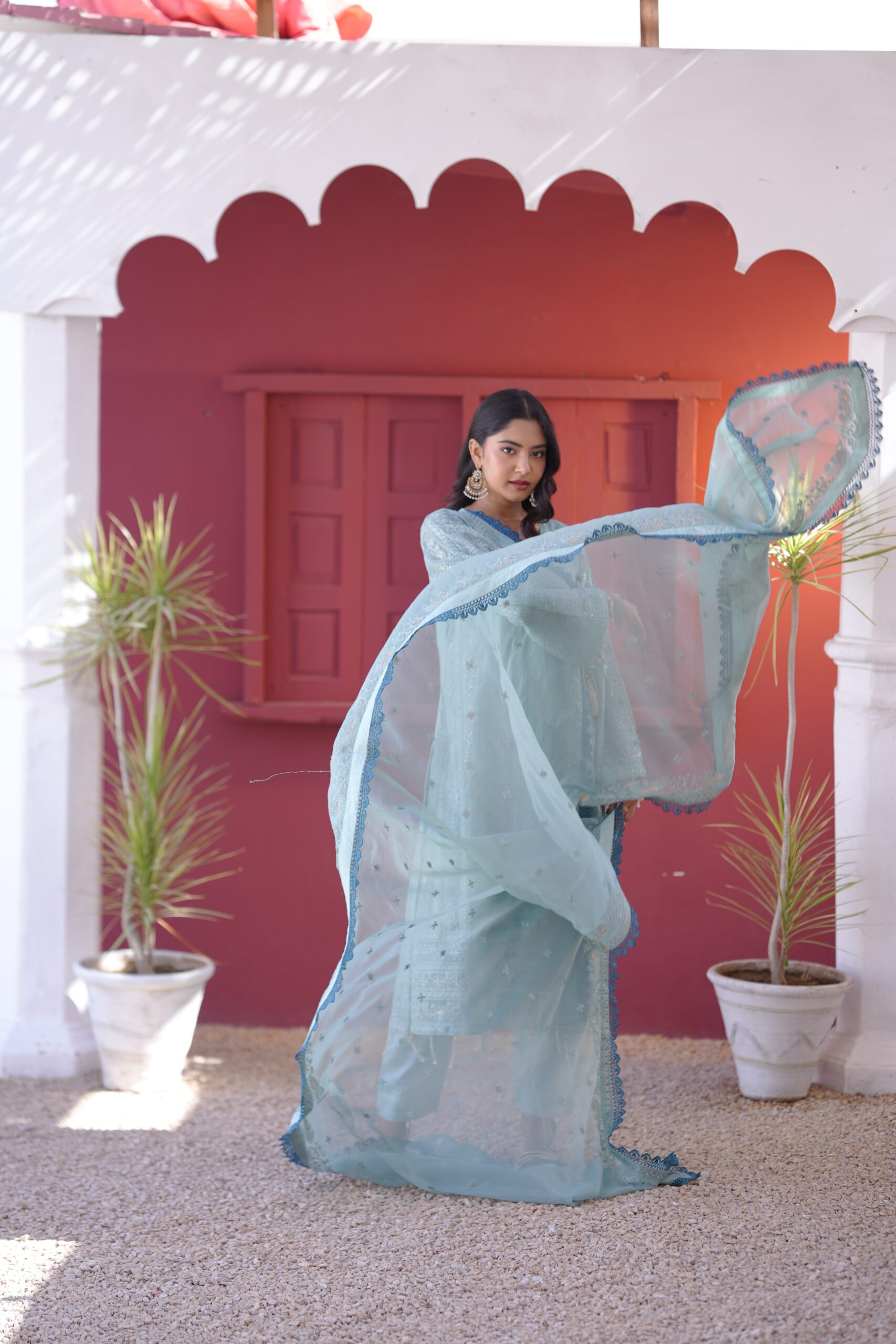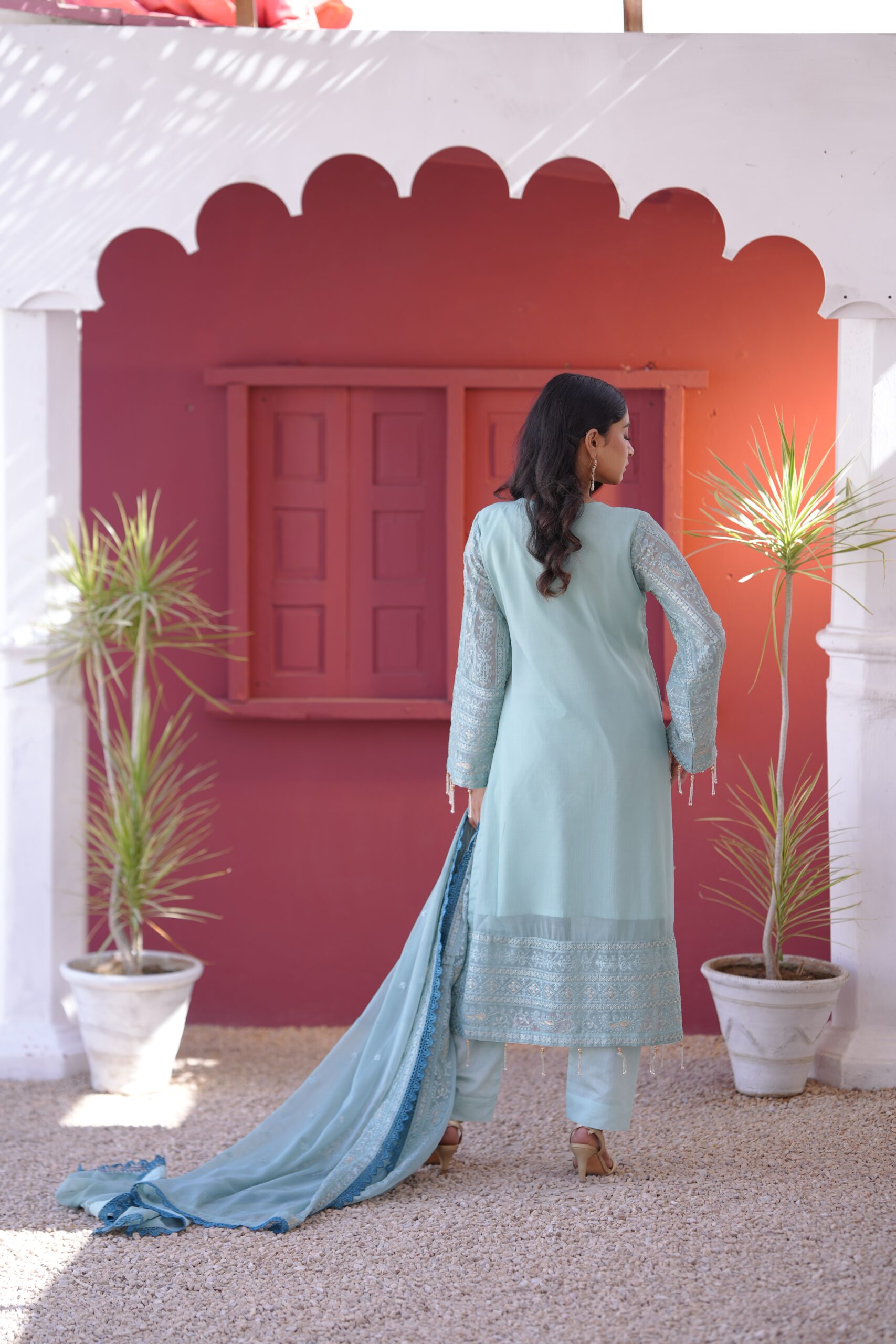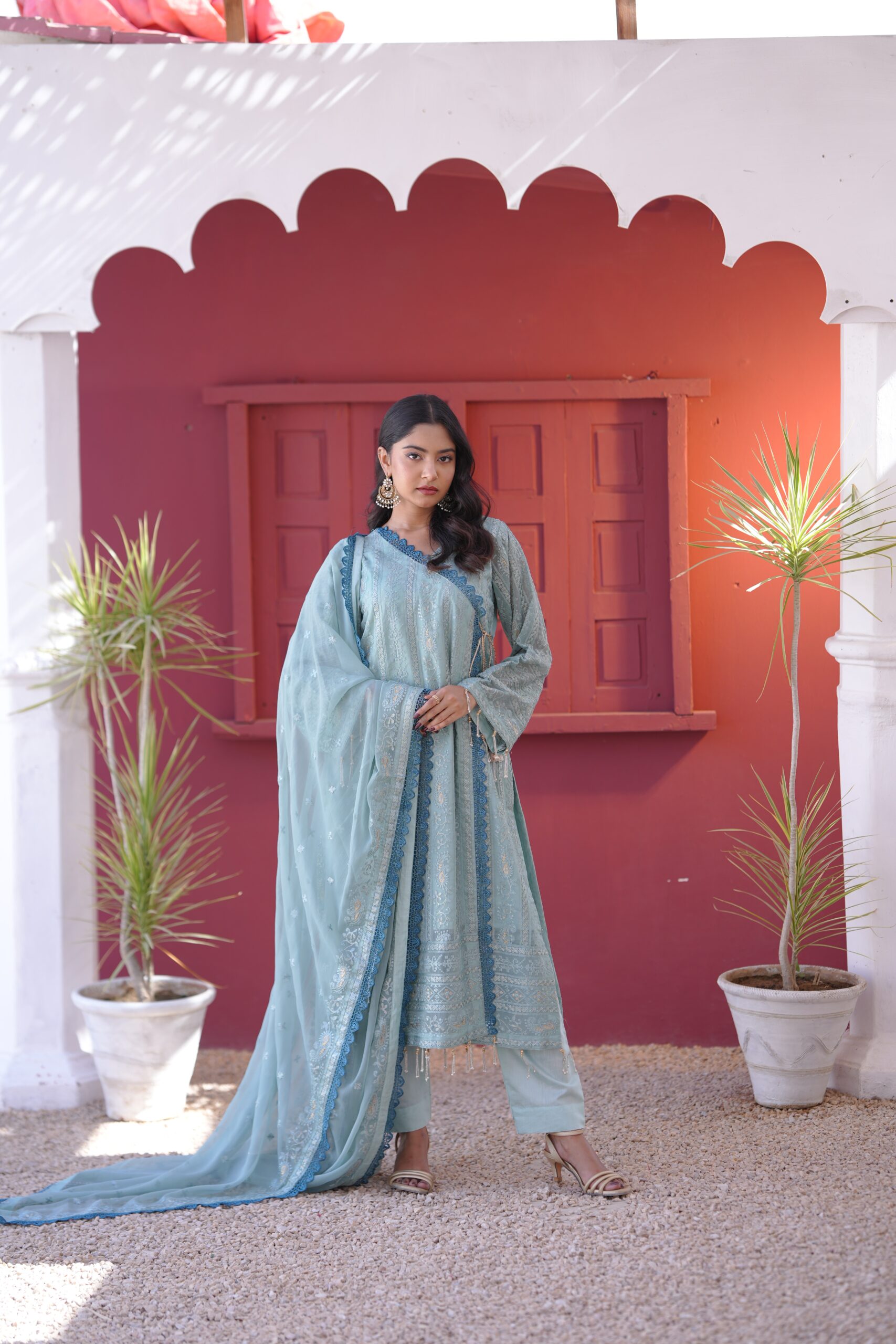 a graceful finish. Paired with a beautifully crafted dupatta adorned with four-sided embroidered