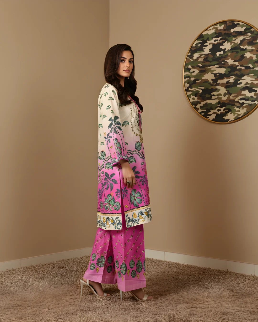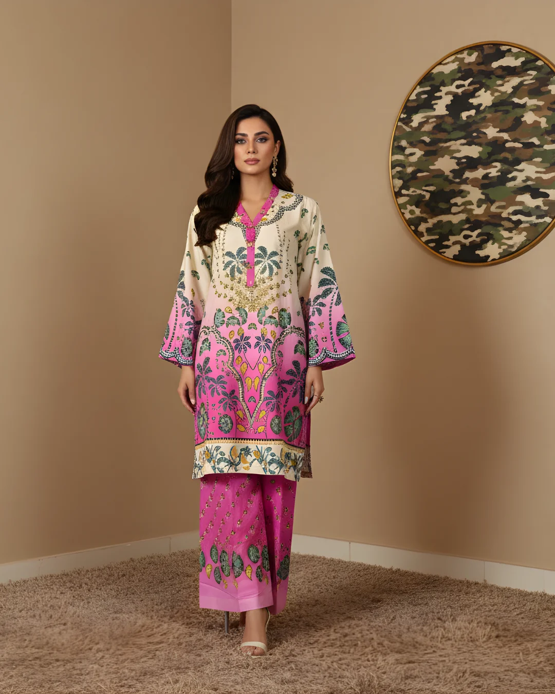 Embrace soft elegance with this blush printed suit, designed for a graceful and effortless look.