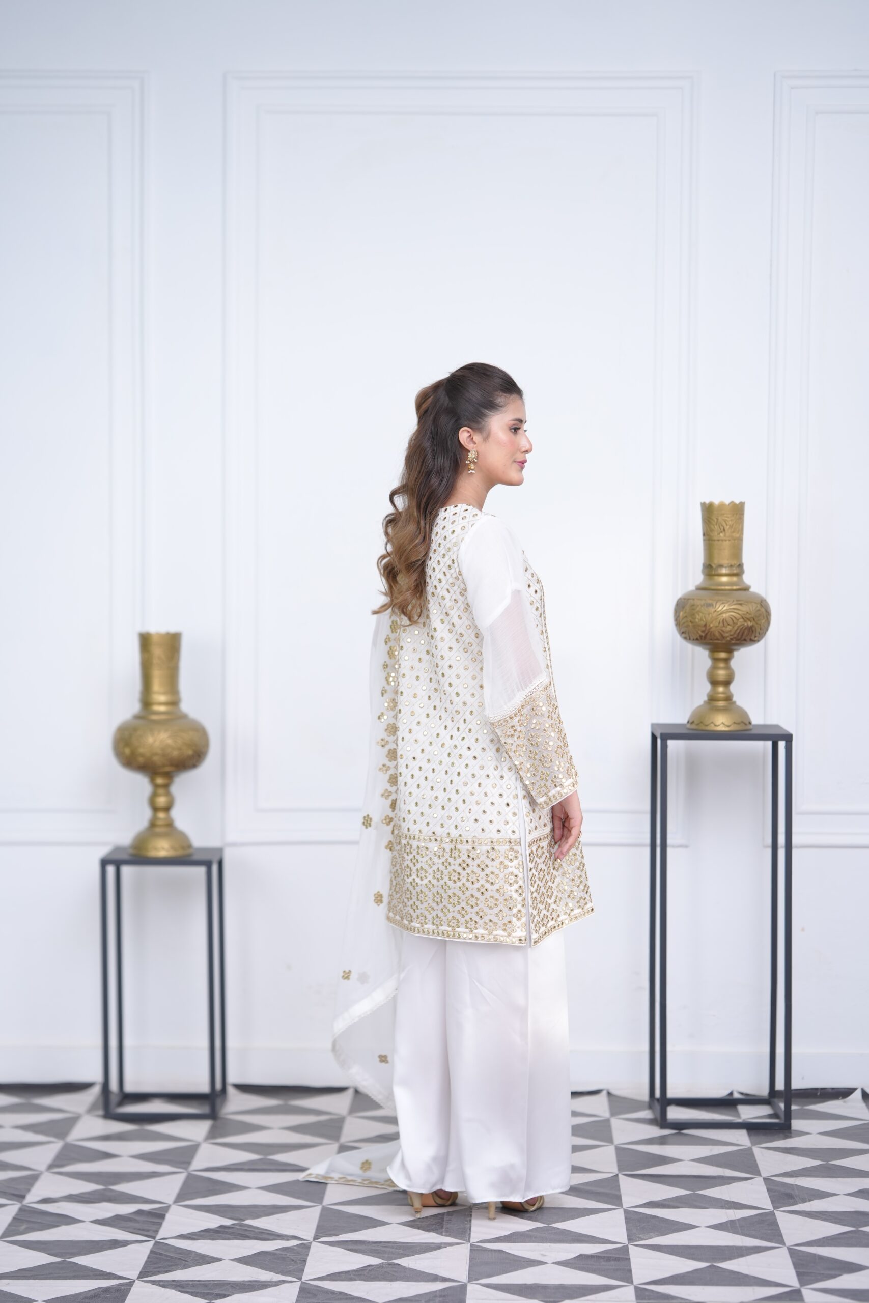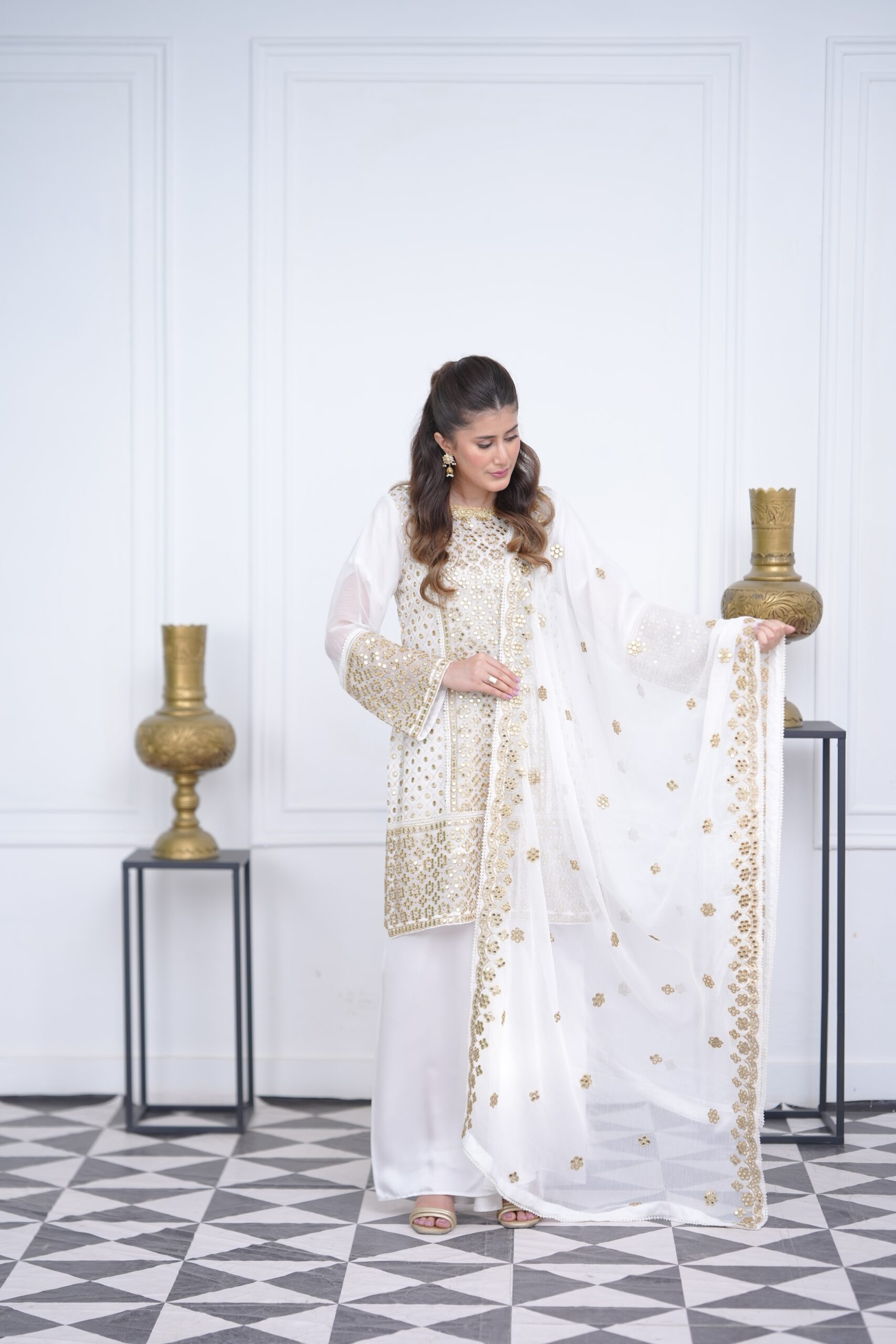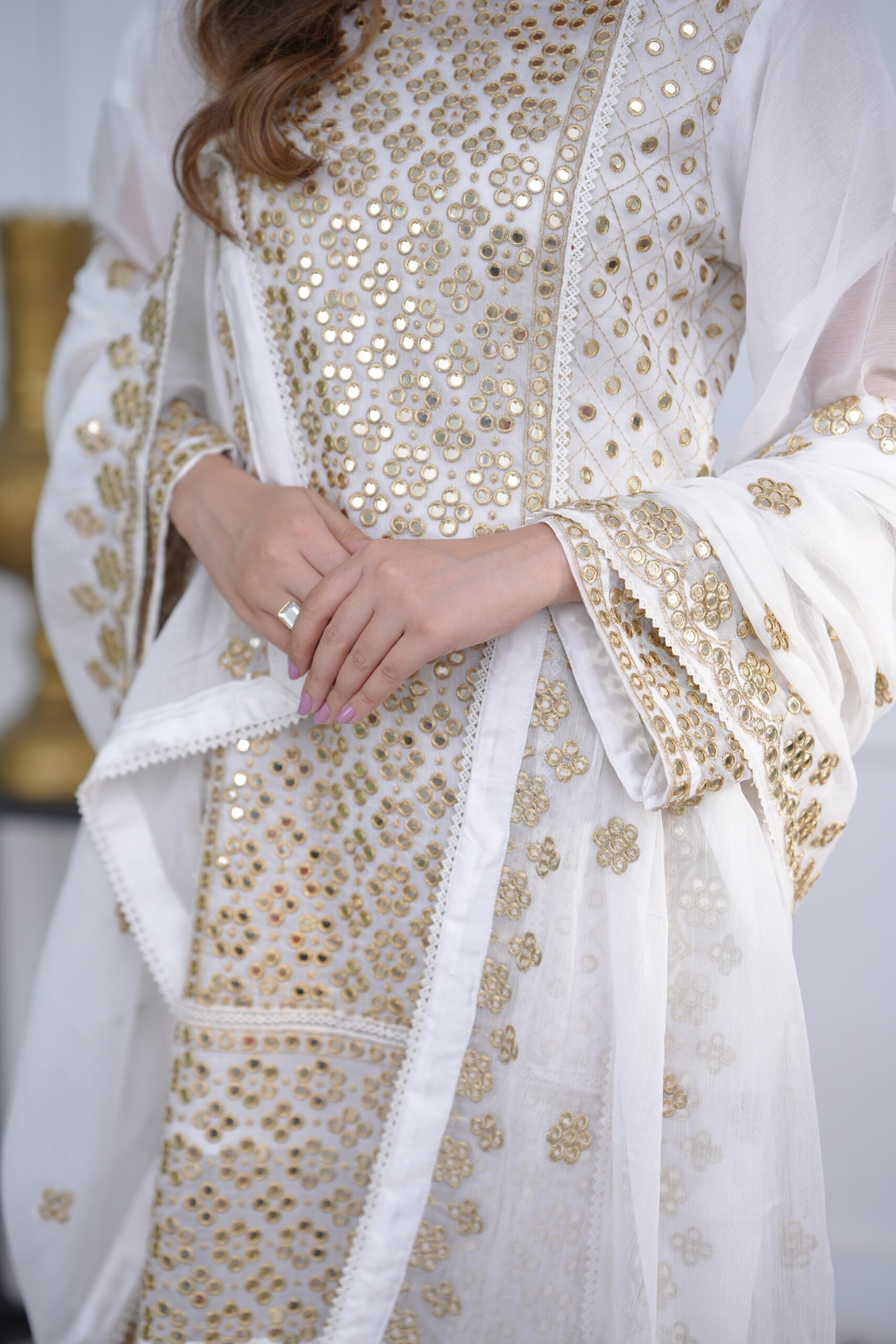 delicate border detailing, adding a luminous charm to the look. Paired with a beautifully crafted