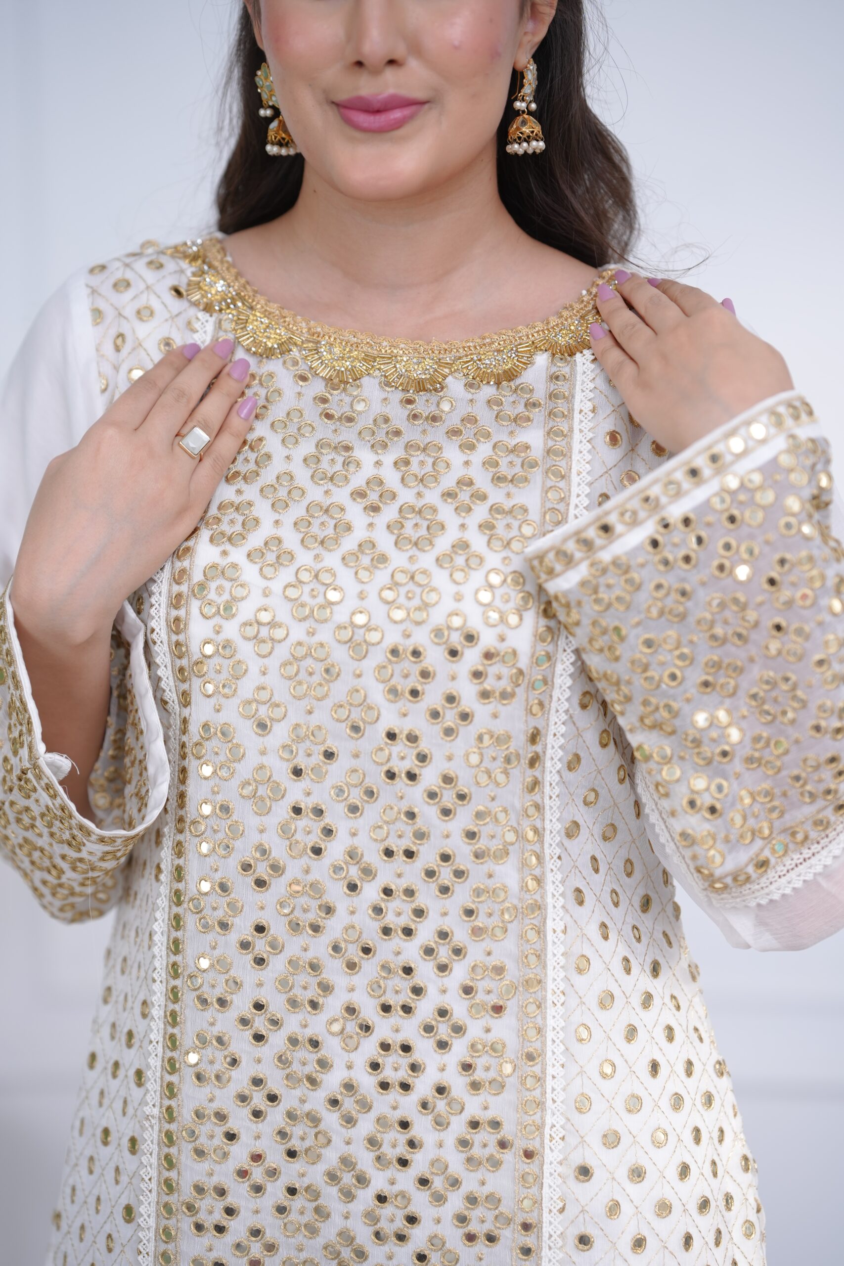yet striking statement. The chiffon shirt is adorned with intricate mirror sequin embroidery and