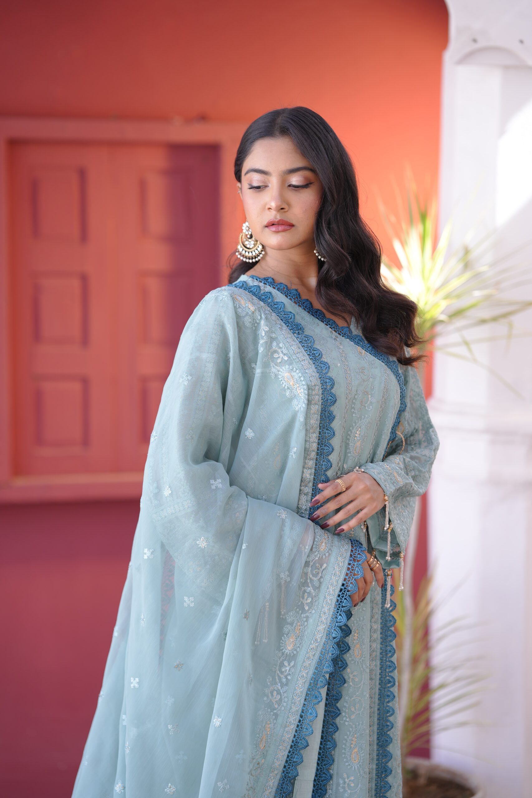 Dupatta: Four side embroidered border dupatta with lace on all sides